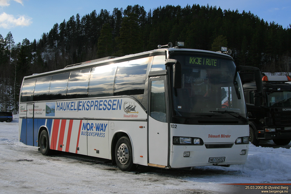 Så forflytter jeg meg til Brunkeberg, der jeg fant Telemark Bilruter #102, som er reserve-/innsatsbuss på Haukeliekspressen. Det er den eldste bussen i Haukeli-trafikken, og den eneste K113. #103 og #104 (K124 fra 1998 og 2000) ble bytta inn i forbindelse med de nye Volvoene på Grenlandsekspressen, så nå finnes det bare én Classic III igjen i trafikk i Vest-Telemark. Fortsatt finnes det i hvert fall én Classic II og to Classic I.