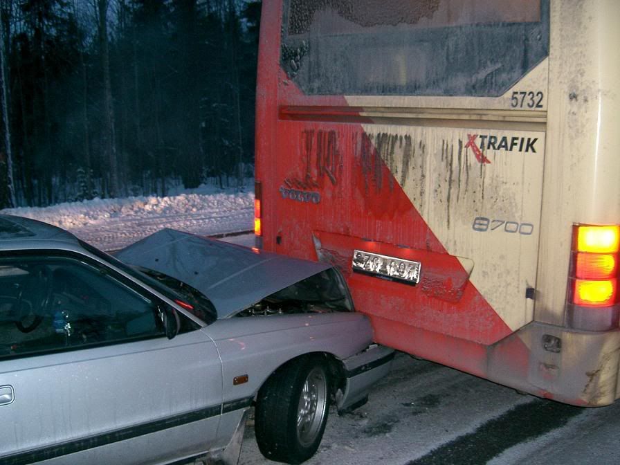 Bussen klarade sig utan skador, men bilen hade nog gjort sitt. Såg ut som på den här bilden.