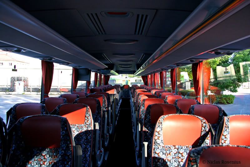 Håller med, snygg buss. På utsidan. Förarplatsen ser lite plottrig ut och klädseln! Medföljer åksjukepiller? Den psykedeliska klädseln kan inte vara bra för folk med anlag för åksjuka.