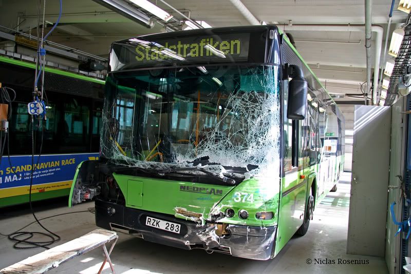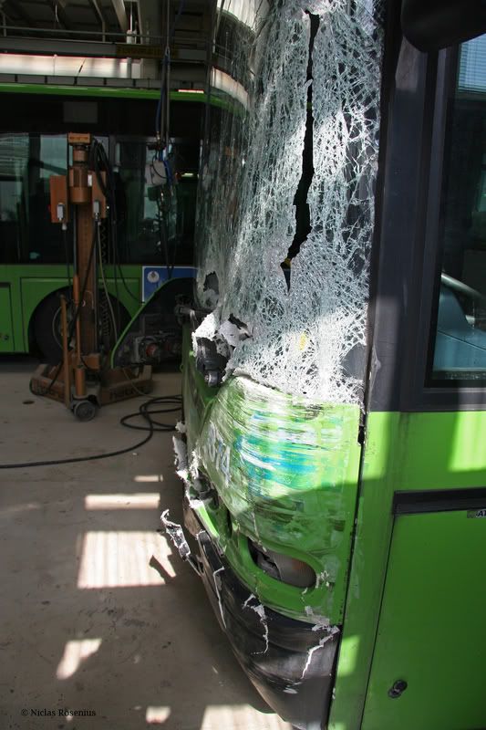 Eftersom det tydligen var en bilist som körde mot rött blir det dennes försäkringsbolag som får avgöra frågan. Men försäkringsbolagen brukar där det är möjligt helst se att bussen repareras, så det blir den nog. Det är naturligtvis lättare att fastställa den korrekta ersättningen för skadan om den repareras än om bussen skall lösas in.