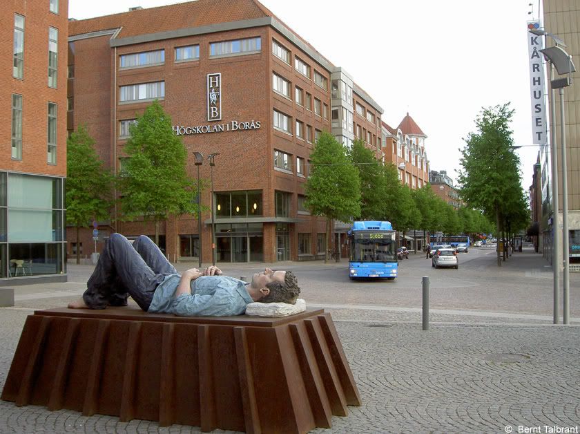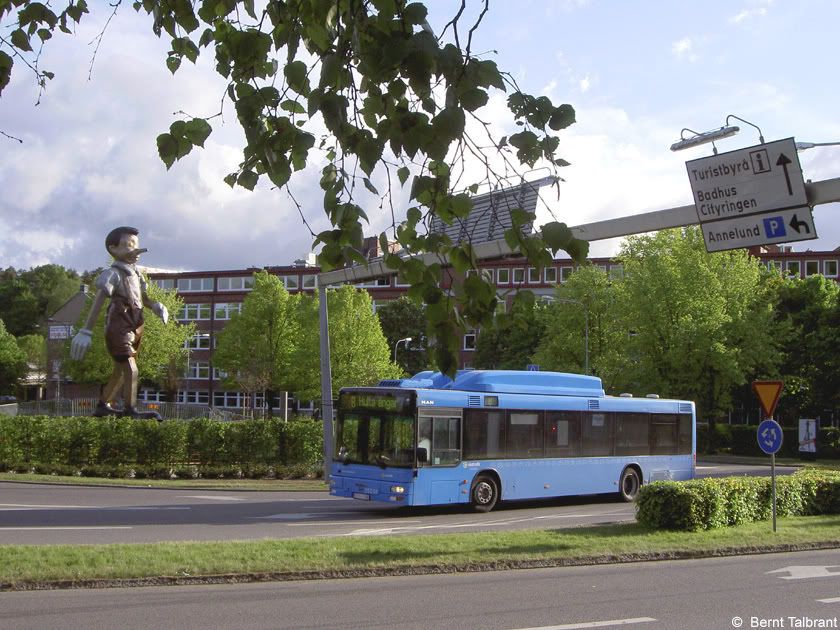 Igår invigdes den 9 m höga statyn "Walking to Borås" av Jim Dine, eller "Pinocchio" som den är mer känd som. Här passerar BL 038 förbi den på Fabriksgatan som linje 8.