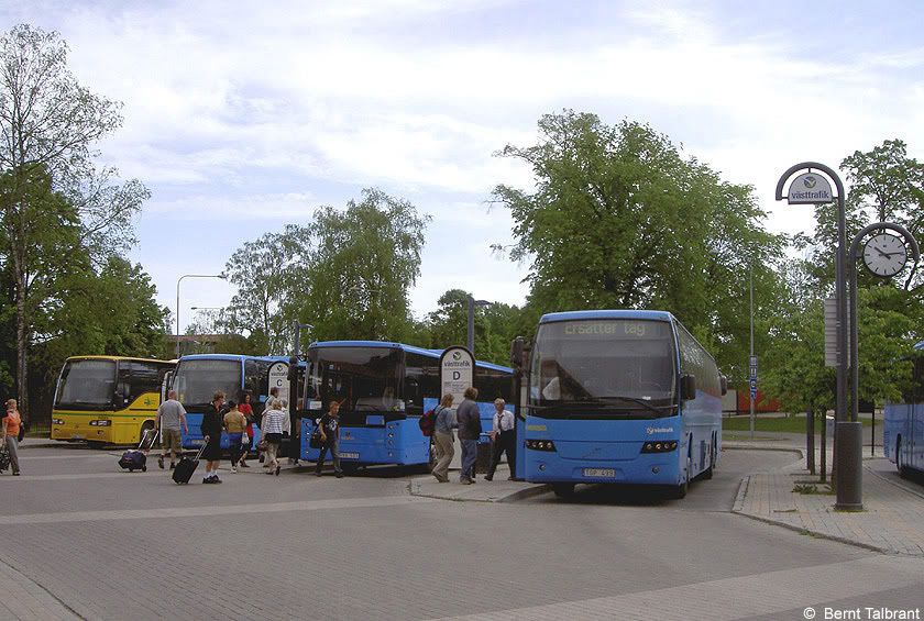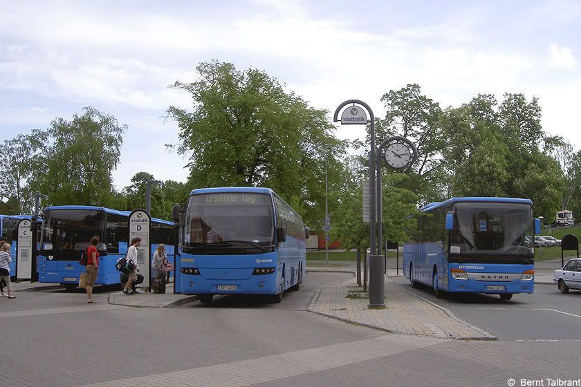 På grund av banarbete är ett förmiddagstågpar mellan Mellerud och Åmål inställt under några veckor. Denna dag var det mycket resande med tåg 671 mot Göteborg och därför fanns fyra ersättningsbussar på plats, tre av dessa syns här: Stigen Buss RYD523, Halmbergs Buss TSP439 och Stigen Buss SWJ271. Den fjärde bussen är Halmbergs Buss ARB394 som skymtar till höger på den första bilden.