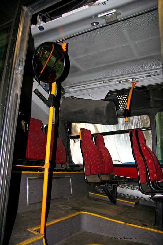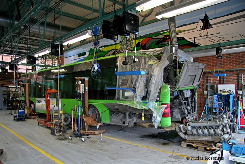 Då jag var nere för att fota dom nya så tittade jag även in i verkstaden och hittade våran 380 där inne. Dom hade tagit ur motor för att den skulle iväg på uppkollning av konditionen. Enligt vad killarna som höll på med bussen så skulle man nu börja att fixa till bussen. Prislapp, ja den som lever får se.