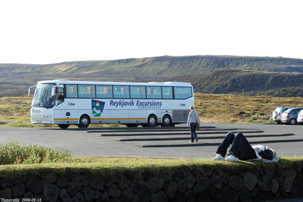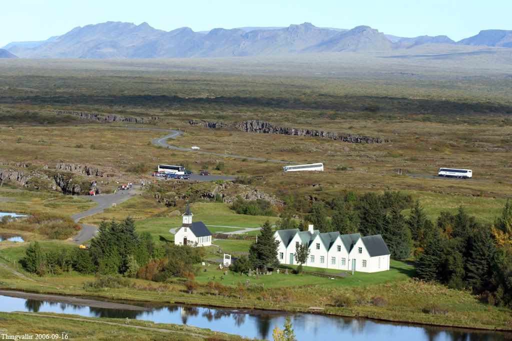 Tre bussar vid Thingvellir, en av Islands mest besökta platser eftersom den ingår i "Den gyllene cirkeln".