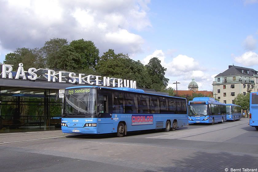 BL 226 verkade ha råkat ut för problem med luften vid resecentrum och en trafikledare kom till undsättning med 056 som här står bakom 226. Hon lyckades få lite bättre fart på bussen och den kunde köras därifrån för egen maskin. 056 gick dock till/från Sandared på 159. Sedan ersattes den av 212 på Södra torget (se ovan).