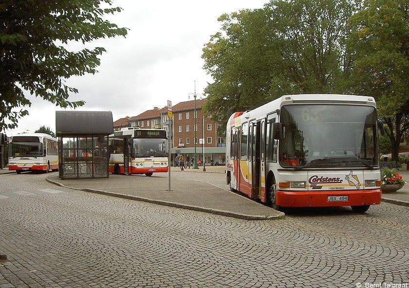 Tre storlekar på stadsbussar tillhörande Trafikbolaget Carlstens i Bodafors AB vid Stortorget i Nässjö på eftermiddagen den 16 september.