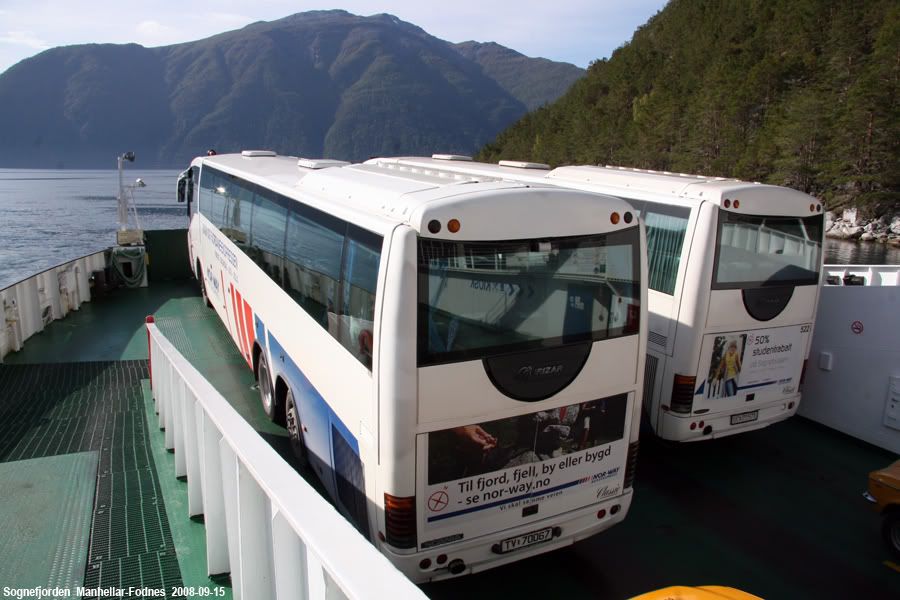 Sogn- og Fjordarne Ekspressen mot Oslo och Sognebussen till Bergen färjar över Sognefjorden.