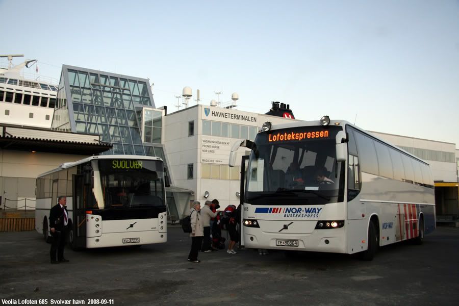 Nästa kväll i Svolvær, förarbyte på Lofotekspressen från Narvik vid terminalen. Den lille Vest:en används som avlösnings"bil".