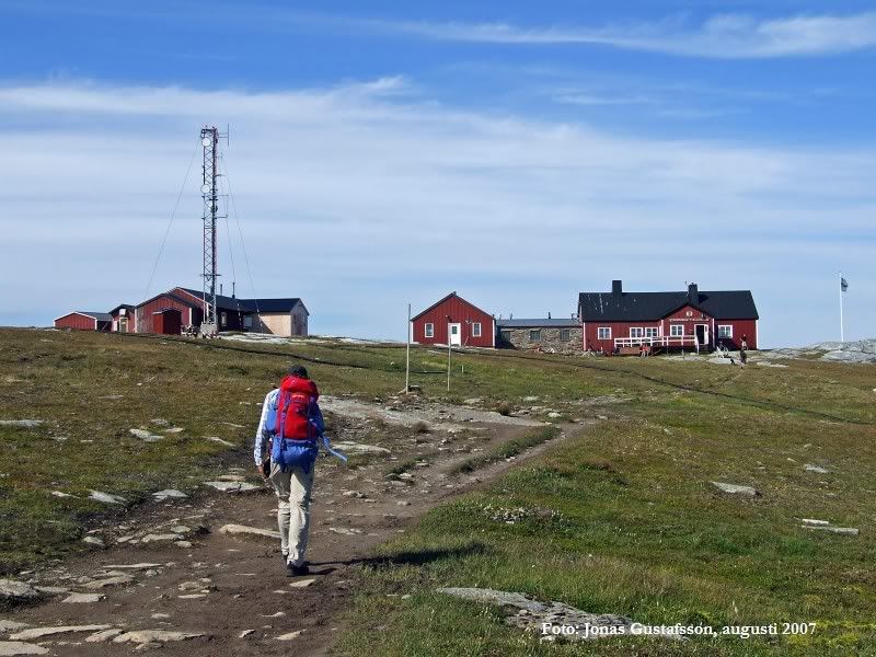 ...som när jag visade solnedgångsbilder från Blåhammaren undrade om jag hade en bild där man såg fjällstationen. Här är en när min kusin (som syns i bild) och jag precis ankommer till fjällstationen efter flera kilometers stigning. Stationen ligger precis på "sadeln" i ett bergspass och är STF:s högst belägna fjällstation samt Sveriges högst belägna etablissemang med fullständiga rättigheter...