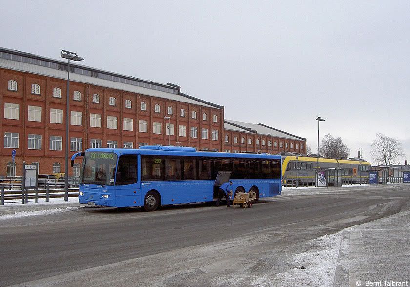Busstationen ligger till stora delar på det gamla spårområdet. Här lossas bussgods ur 6872 som kommit på linje 200 från Skövde.