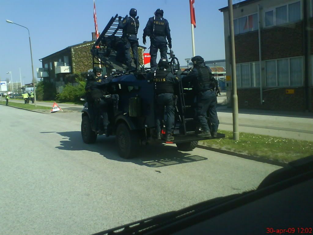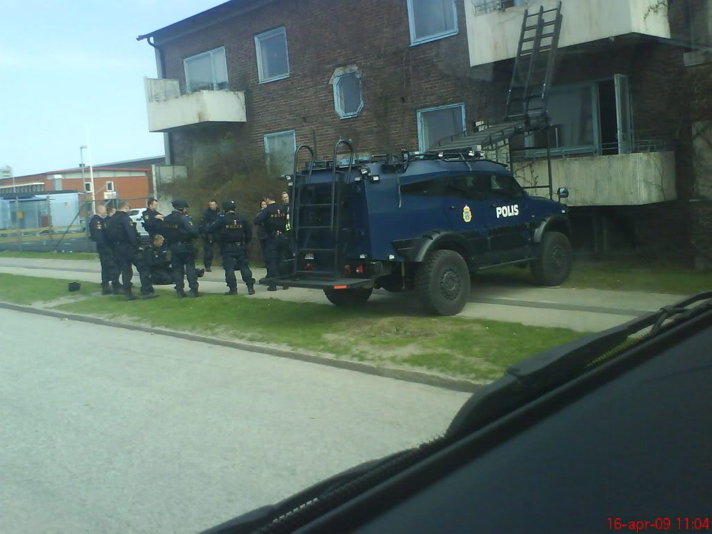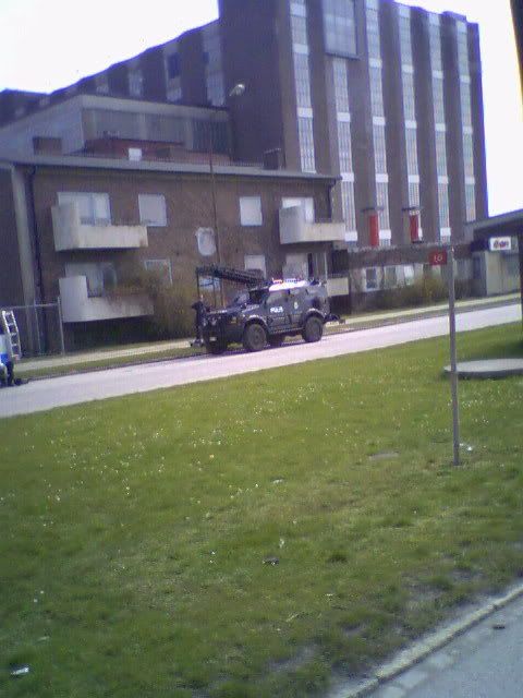 De hade övning, körde till mot balkongerna och "stormade" in på balkongerna med dragna vapen, liknade kulsprutor men de var kortare. cirka 6-7 polisre hängde på bilen, såg ganska tufft ut. ;)