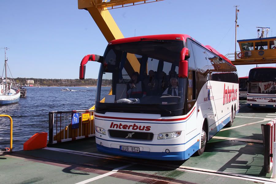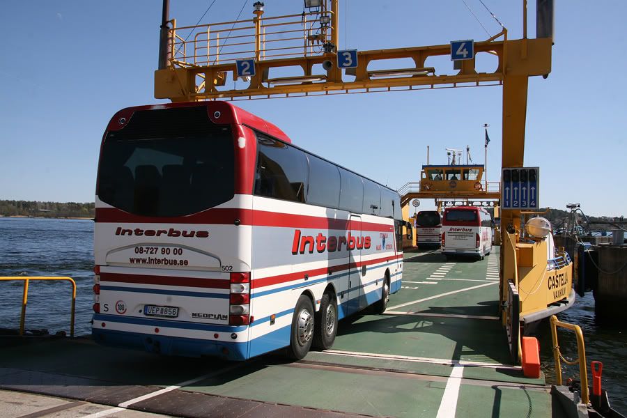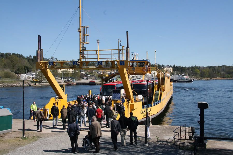 Åter i Vaxholm, bussarna färdiglastade att rulla av färjan.