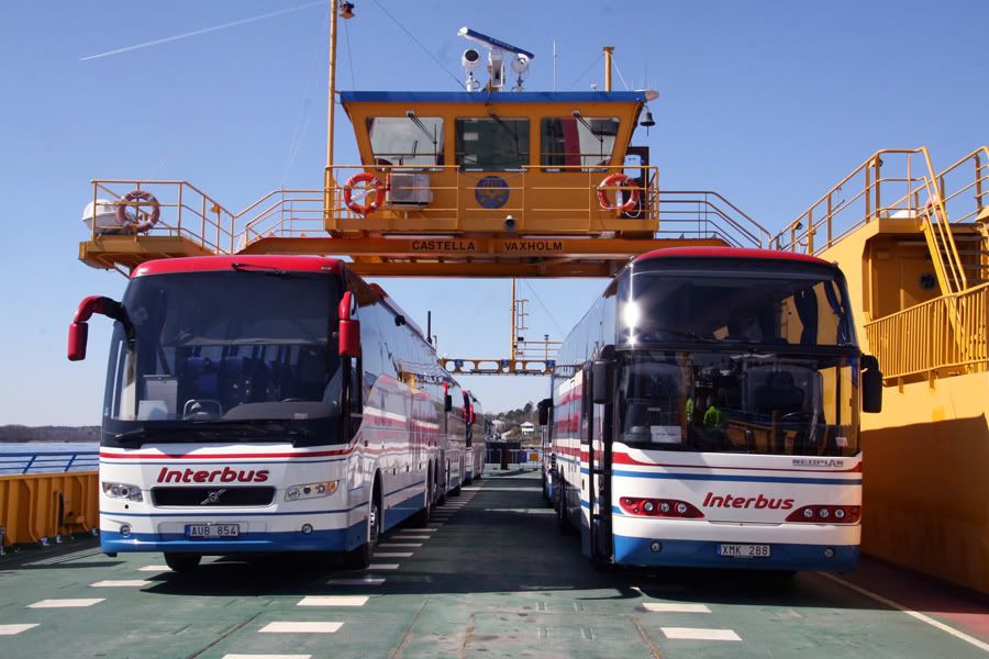 Sedan e det väll inte så varmt ute till havs heller denna tid på året. Och stå på färja med snålblåst och åka när man kan sitta lite högre än vanligt och se ut och sen ha det varmt och gott. Sen så e det ju den som abbonerat bussar som betalar kalaset så om dom vill ha bussar på en färja så ska dom få det.