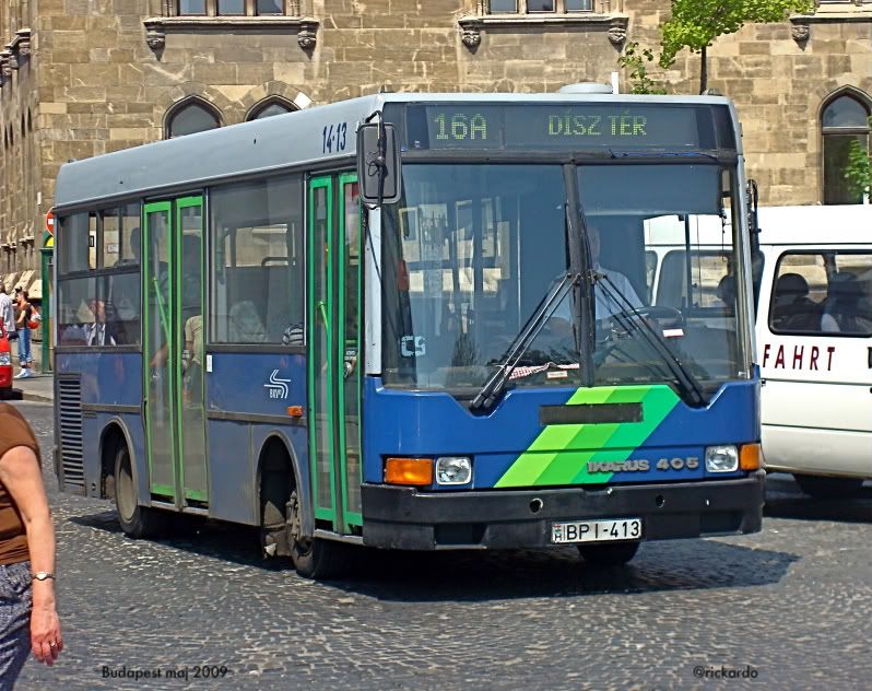 En liten Ikarus 405 i en av mina favoritstäder, Budapest i Ungern. Dessa småbussar körs på trånga gator i gamla delar av stan. Kollektivtrafiken är väldigt bra och det finns bussar, trådbussar, spårvagn, och tunnelbana. Tyvärr är de flesta av de riktigt gamla spårvagnarna borta och ersatta med nya. Tunnelbanan är från 1896 och är näst äldst i världen. Många av bussarna är Ikarus men även en hel del nyare Volvo 7700 finns i trafik (vilket jag inte tycker är speciellt roligt som bor i Malmö)