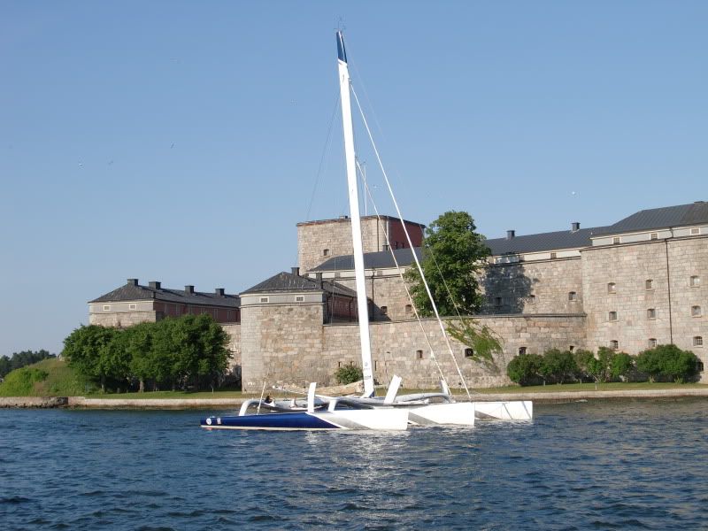 En trimaran som drog många blickar till sig, här med Vaxholms Kastell i bakgrunden