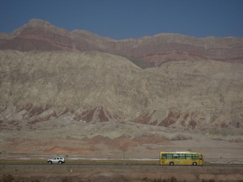En bild tagen på en av dessa långlinjebussar i Taklamakanöknen. Bilden är tagen från tåget. När nu kineserna byggt en järnväg ända in till Kashgar är det klart man ska åka tåg!  :D