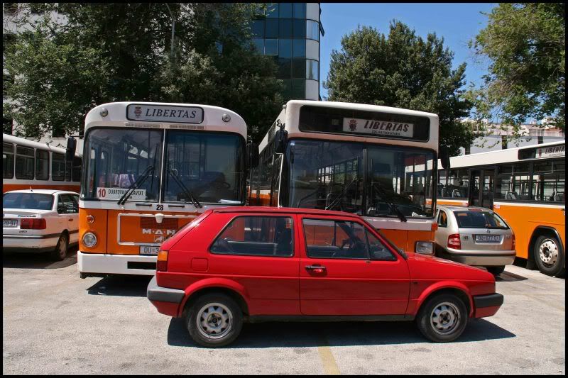 Till vänster i bild står det en man halv skymd av den röda lilla golfen. Har du någon mer på bild på den bussen eller en av samma modell. Karossen passar nämligen på ett ungefär och rejält god vilja in på så många andra bussmodeller. Påminner om Ikarus, Scania CR76 /111 osv osv.