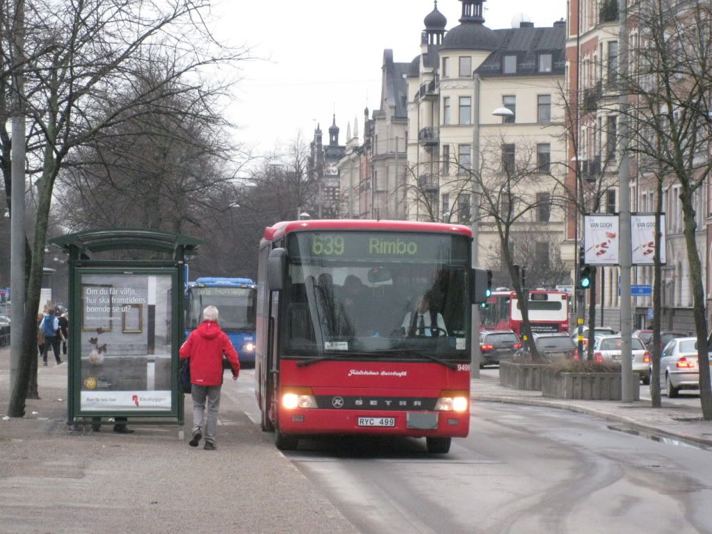 Fridströms Setra, som förekom i den 5:e bilden ifrån A-delen av Teknis-bilderna, laddar om för en tur till Rimbo på 639:an.