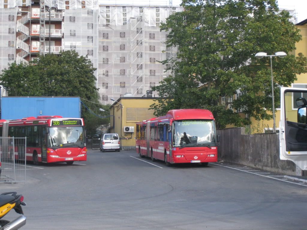 3743 och 3836 har kört fram till en typ av parkeringsplats, där man inväntar tiden då man skall köra tillbaka till busshållplatsen och lasta på nya resenärer på den nya avgången på resp. linje. Platsen där fotot är taget, ligger vid Karolinska vägen, strax västerut om busstationen vid Karolinska Sjukhuset.