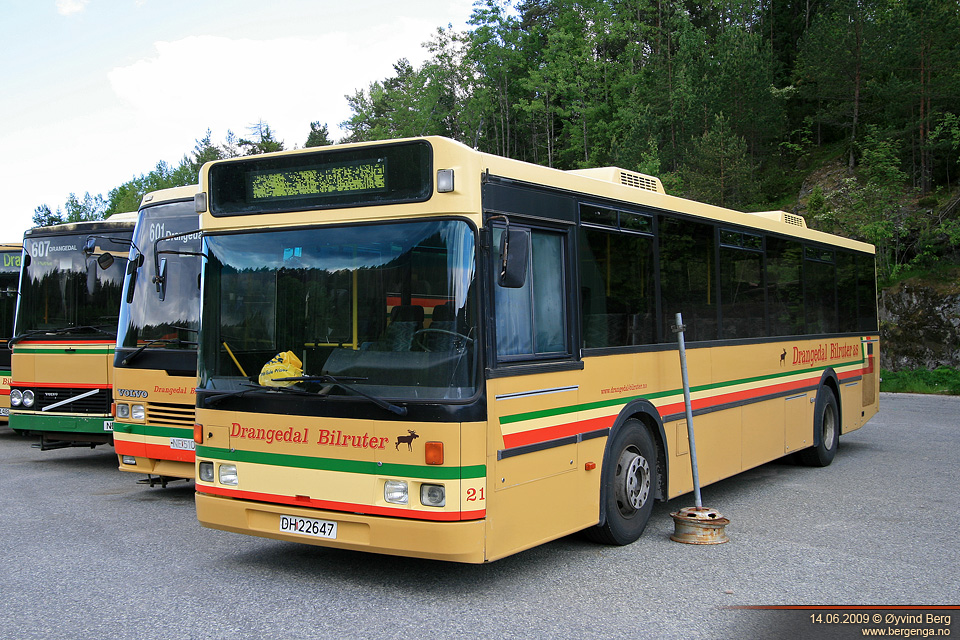 Først ut er #21, en Mercedes-Benz OH1627L med Arna M91BF fra 1993. Levert til Bertel O. Steen (MB-importøren i Norge) høsten 1993 før den kom til Ing. M.O. Schøyens Bilcentraler (SBC) i februar 1994, hvor den var #238 og senere #021. Til Drangedal Bilruter kom den i juni 2002.