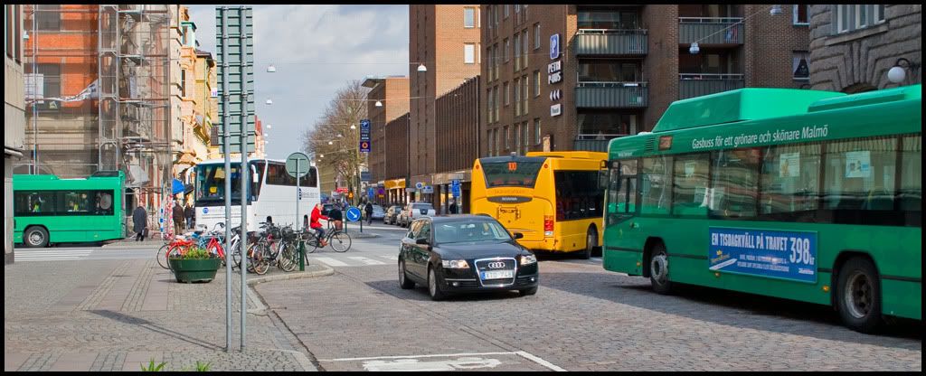 1990 när jag började köra i Malmö så gick busstrafiken till och med dubbelriktad på gatstumpen i förgrunden och ner i en sväng mot centralen. Främst var det bussar som kom från andra änden av bilden - alltså från Caroli City-hållet som körde rakt fram. Några linjer (15 & 21) körde däremot rakt fram från höger till vänster och tvärtom i korsningen i bilden - medan resten svängde runt hörnet som linje 11 tex.