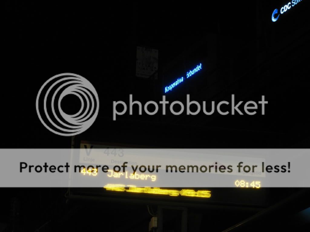 Vid vissa hållplatslägen där inga nattbussar eller busstrafik skulle komma på flera timmar framåt, så var hållplatskyltarna avstängda. Det fanns dock vissa undantag och skylten vid hållplatsläge V för linje 443 mot Jarlaberg var ett av dem...  ;D Nästa buss skulle inte avgå förrän om exakt 7 timmar! Känns som en ganska så lång väntan. :P