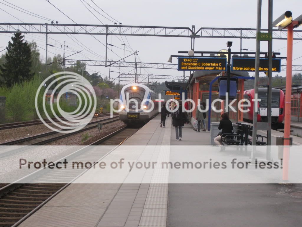 Under Kristi Himmelfärdshelgen, så rullar det nu information på stationernas destinationsskyltar om att det är 30-min trafik på Stockholm C-Bålsta. Jag är däremot rätt säker på att det även var 30-min trafik på Stockholm C - Märsta igår, då ett växelfel hade drabbat Upplands Väsby station. Detta innebar att samtliga pendeltåg stannade på det spår som normalt sett är skapat för Märsta-tågen. Växelfelet drabbade även Upptåget, så Upptåget och SLs pendeltåg fick båda dela på ett spår en sträcka tills växelfelet var lagat. Pendeltåg mot Södertälje, bestående av X60 6057, ankommer stationen och till höger skymtar Upptåget med individnummer 9055, som är tursatt mot Uppsala och Tierp.