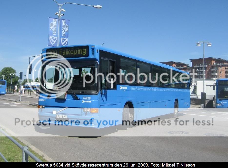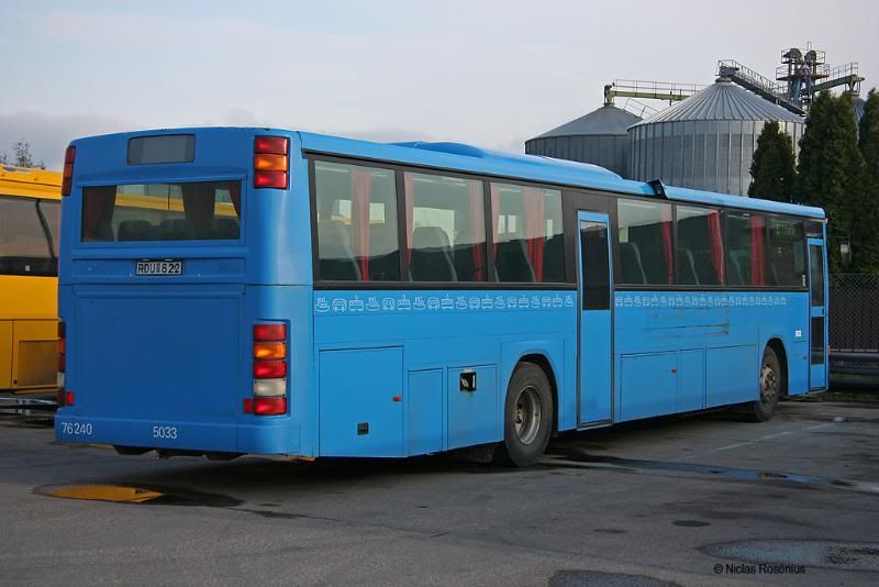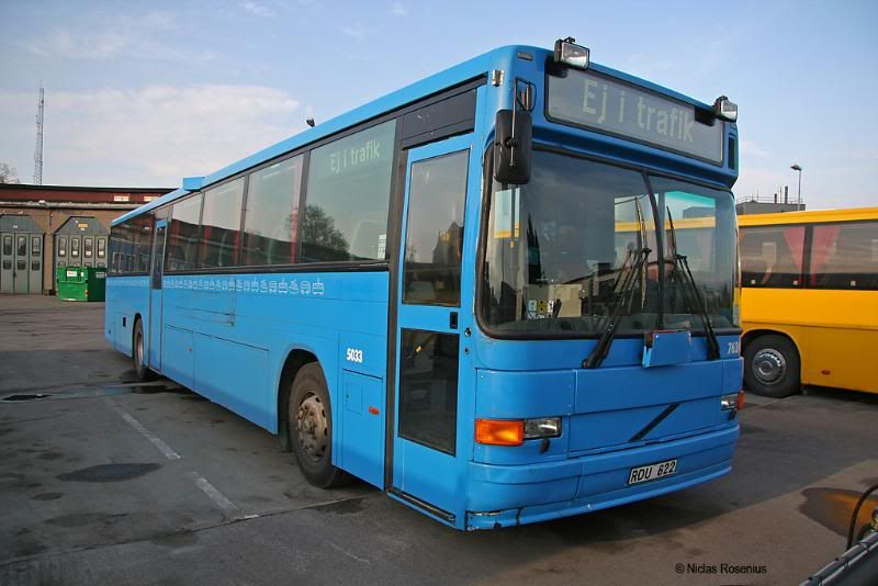 Här är en bild på systervagnen 5034 i Skövde sommaren 2009. Det var före Nobina-tiden. Enligt mina anteckningar var bussen då stationerad i Falköping. Jag tror att det även gällde 5033 som nu har flyttats till Uppsala.