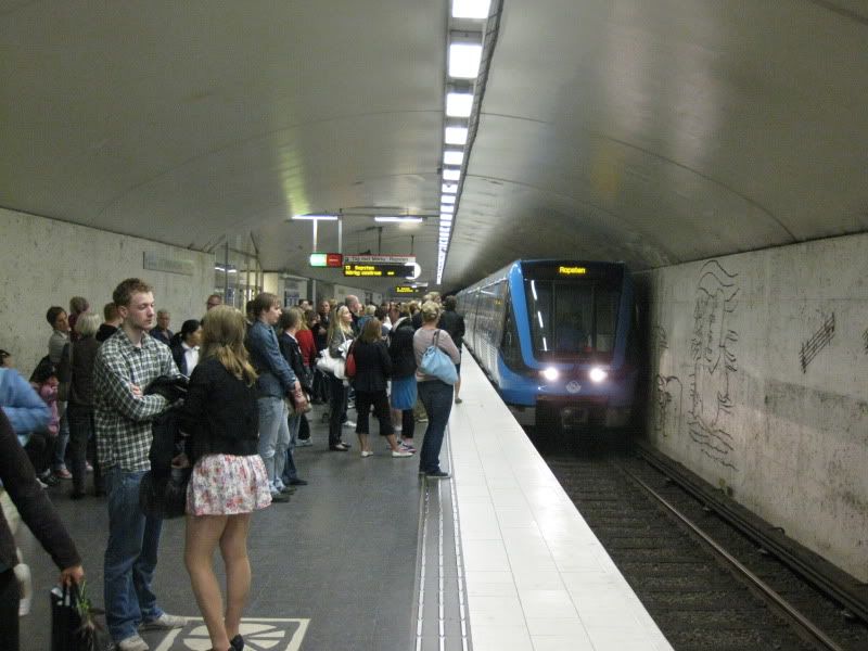 Situationen kl. 18:10 vid Östermalmstorg vid plattformen för tåg mot Ropsten och Mörby Centrum. Tågen låg på kö efter varandra. Se på nästa bild, så förstår ni vad jag menar: