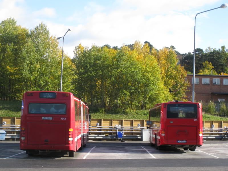 Två bussar som det har diskuterats om en hel del den senaste tiden här på forumet. Till vänster en av de två f.d. stombuss-Säfflelederna och därinnan f.d. Örebroarna 3242 och 3253, där 3242 idag kom med på bild i dess numera röda skepnad, så som även 3253 har fått. Till höger står en f.d. Sörmlänning, men som numera är en av tre bussar som man skulle kunna kalla för "nyaste generationen av Ljusteröbussar". Idag vart det 1211, som tillsammans med systrarna 1210 och 1212 normalt används för trafiken på Ljusterö, samt kanske ev. turer inne på fastlandet.