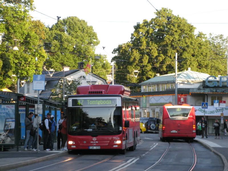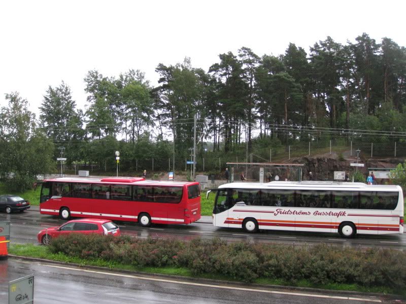 Två av Fridströms Setror, 9443 och BGY567 blir fyllda med resenärer vid Täby Centrum. Vid fototillfället, så hade jag och en stor grupp resenärer klivit av vid stationen. Tåget som vi reste med var ett 6-vagnars snabbtåg och i och med att Österskärslinjen var avstängd från Österskär fram t.o.m. Åkers Runö, så hade tåget endast möjlighet att kunna vända vid Hägernäs (eller kanske var det Viggbyholm). Övriga resenärer som då skulle resa vidare mot främst Åkersberga och Österskär, hänvisades då till särskilda bussar från Täby Centrum, vilket som sagt Fridströms fick bidra med. Fotot är taget den 25 Augusti.