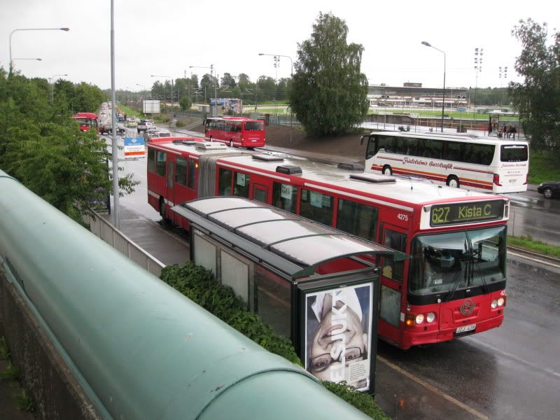 Busslink 4275 på linje 627 mot Kista Centrum gör uppehåll vid Marknadsvägen, precis nedanför Täby Centrums bussterminal. I bakgrunden syns Fridströms setror från bild 3. Foto från den 25 Augusti.