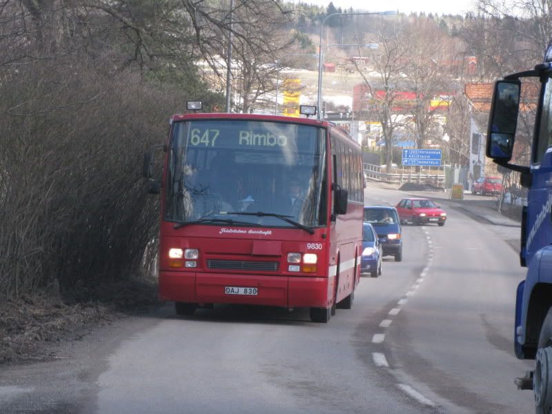 Fridströms Carrus Fifty med inv. nr. 9830 på en tur på 647 ankommer kort efter fotoplatsen Rimbo busstation. Foto från den 6 April.