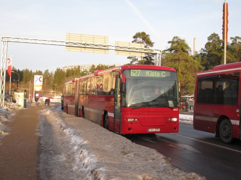 Jag höll först på att ta denna B12:a för en av de bussar som flyttat upp från Handen, men nu såg jag att det ju faktiskt var en av de även tidigare Täby-vagnarna, nämligen Keolis 5685. Till skillnad från B9Sen till höger, så har denna en ganska hyfsad bit kvar till sin slutdestination.