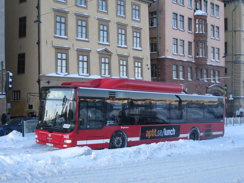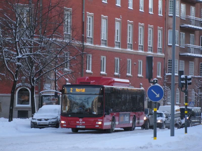 Vid Birger Jarlsgatan, så dök det upp en 2:a, i form av Keolis 7454. Förutom de ledbussar som jag fick syn på vid Slussen, lite senare i denna bildserie, så fann jag bara kortvagnar på stomlinjerna, samt en del boggiebussar vid Gullmarsplan. Men som sagt, ledbussarna lös, i mitt fall, verkligen med sin frånvaro: