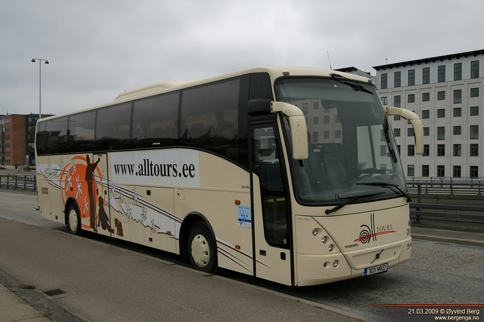 Bussen jeg har bilde av er en 2002 Volvo B12B 4x2 med Jonckheere Mistral 70 "Arrow" karosseri. Men i 2007 kom den til Estland og Alltours OÜ i Pärnu, hvor den har reg.nummer 303 MKD. Da er det nok sannsynlig at den du fotograferte er fra 2007, siden man normalt overfører reg.nummer til ny buss i Belgia. (Skiltet eier man, og så monterer man forskjellige busser på det opp gjennom årene ...)
