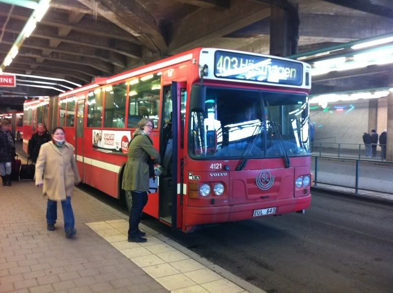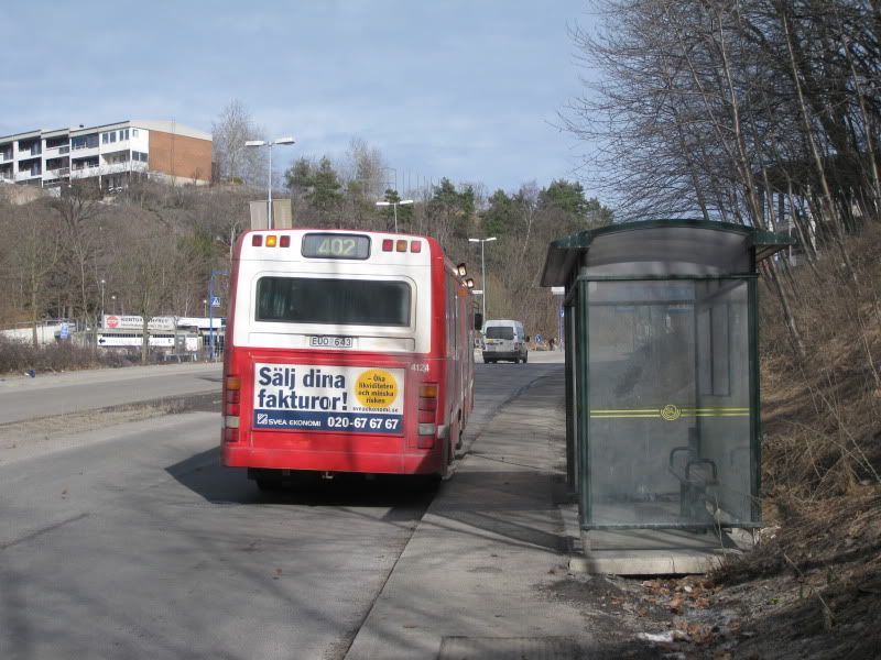 samt 4124, som det inte var alltför lång tid sedan jag åkte en kort tur med - från Slussen till Henriksdal (bussen gick då på linje 402 Slussen - Kvarnholmen.) Måste bara säga detta - vilken buss! :D Jag satt ett par stolsrader bakom den bakersta dörren och jag hade ingen aning om att motorn ens var igång, då den inte hördes! ;D Sen när vi svängde ut, så hördes ingen skillnad och sen fick motorn kämpa lite när vi for iväg. Återigen, det var den dagens stora lycka - enligt mig en mycket fin och häftig buss. Hoppas verkligen att det blir fler turer innan augusti, har sett flera ur 412X-serien som kämpar på i trafiken. Rock on, säger jag bara! ;) Här är bussen i fråga: