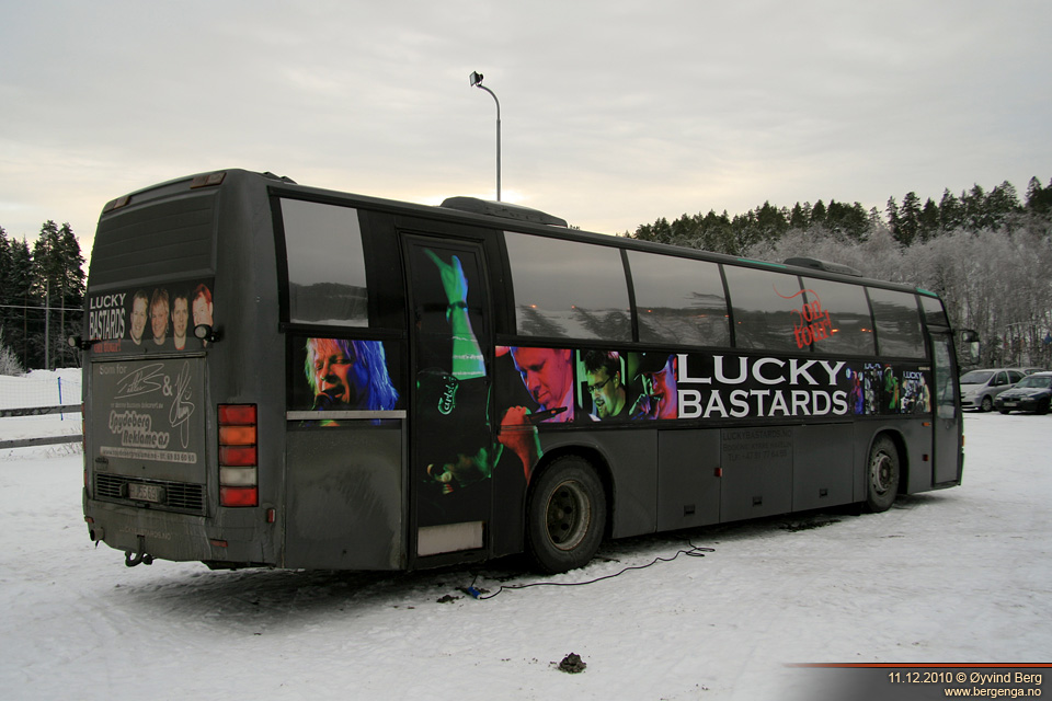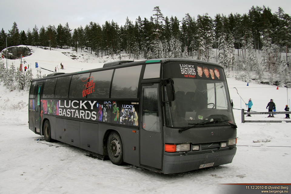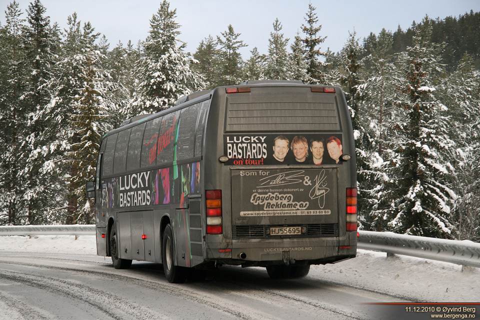 Første bussen fikk jeg faktisk bilde av før jeg var kommet fram. HJ55695 er en Scania K113CLB, Delta Star 301 fra 1990. Opprinnelig var den NSB Kongsvingerruten #67, mens internnummer hos NSB Biltrafikk Lillestrøm og Nettbuss Lillestrøm er jeg usikker på. Der var den i hvert fall i trafikk frem til 2005 da bandet Lucky Bastards fra Spydeberg overtok den. Det er bandets bassist Kyrre Havelin som eier bussen og har innredet den. Campinginnredningen var blant de bedre jeg har sett på en sånn buss, men det ble dessverre ikke noe bilde. Lucky Bastards er et rockeband av typen jeg vil kalle "selskapsband". Det vil si at de spiller alt mulig av andres låter etter ønske. Bandet var på tur sammen med noen andre musikerkollegaer den dagen for å stå på ski, faktisk ikke for å spille.