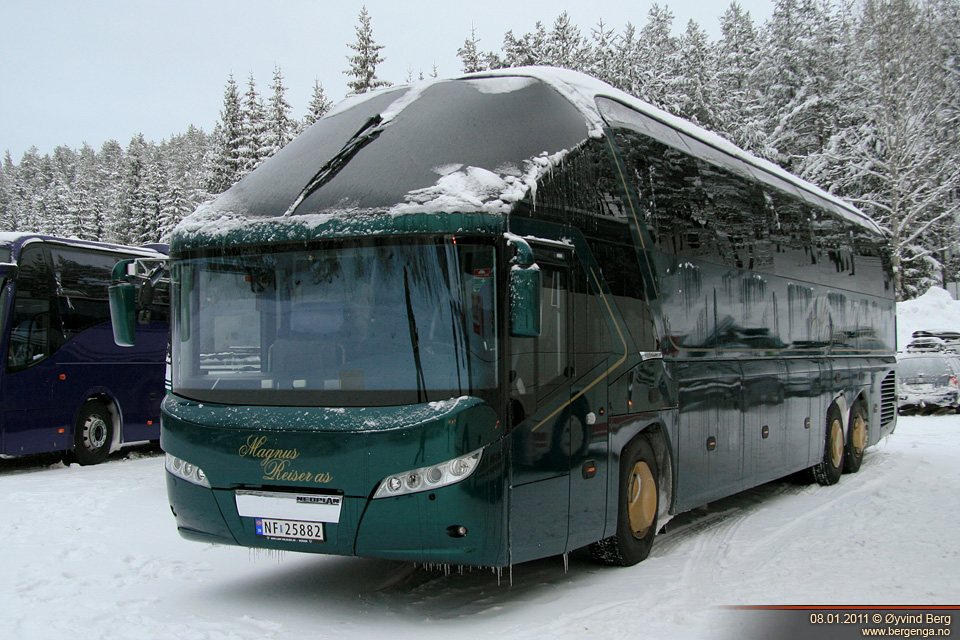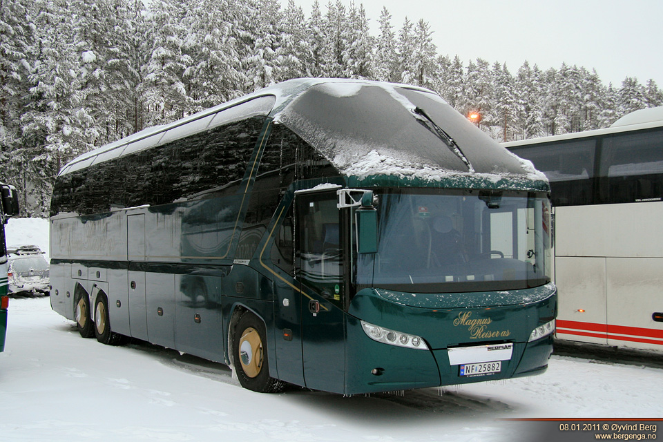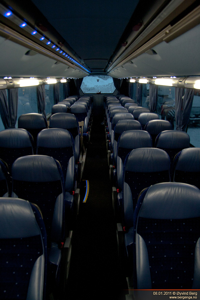 Magnus Reiser sitt romskip var utvilsomt dagens flotteste buss. Han var også veldig stolt av bussen og viste den gjerne fram. Bussen er fra 2007 og er en Neoplan N5218SHDL Starliner. Da Magnus skulle velge farge på bussene sine så var inspirasjonen visstnok en ølboks, og resultatet ble i hvert fall bra, selv om det var litt mørkt for fotografering den dagen.
