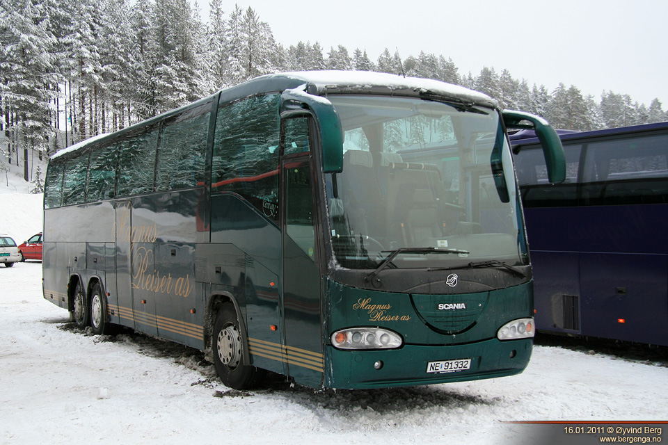 NE91332 er en Scania K124EB 6x2, Irizar Century II 37 fra 2002. Dette er Magnus Reiser sin aller første buss. Neoplanen er hans andre og en Scania K480EB 6x2, Irizar PB 37 fra 2009 er hans tredje. Alle tre bestilt fra fabrikk. Det er alle bussene han har hatt. I motsetning til de fleste som starter for seg selv med minibusser eller med noe gammelt skrap, gikk Magnus rett til banken og ville ha lån til en skikkelig turbuss.