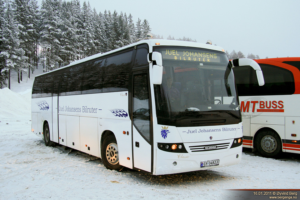 Juel Johansens Bilruter var innom med sin snøhvite Scania K114EB Classic IV 360 Comfort. Levert til SAS Flybussen i 2001.