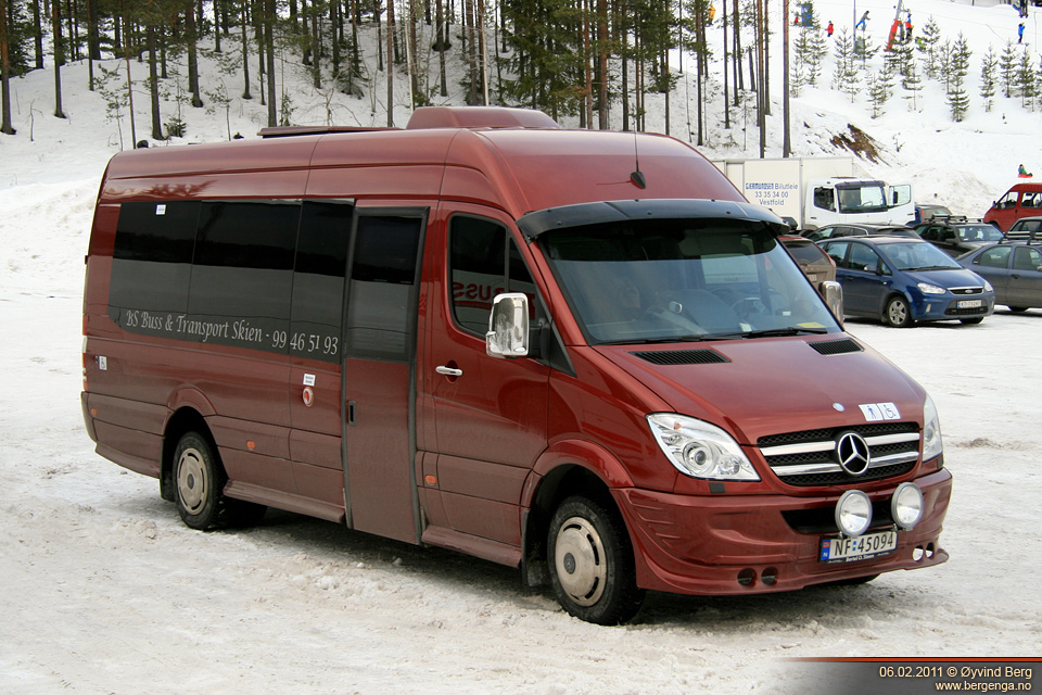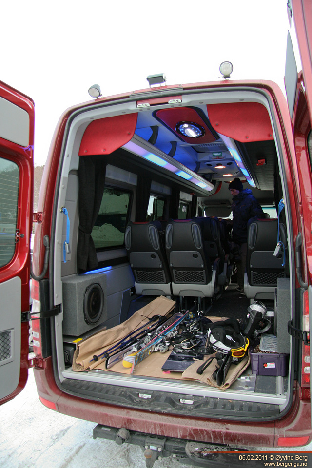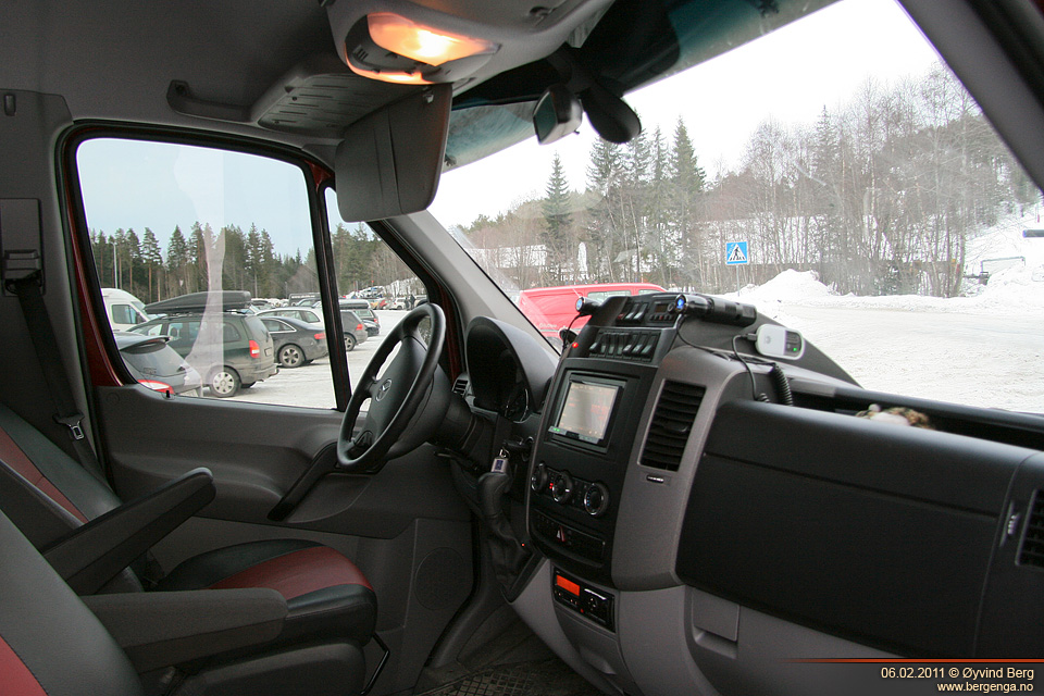 Bussen han hadde med er en Mercedes-Benz Sprinter 519 CDI med innredning fra Iseveien Bilinnredning AS i Sarpsborg som ble registrert i september i fjor. Bussen er blant de aller fineste minibusser jeg har sett, både interiørt og eksteriørt. Han ville ikke være nødt til å ha knapper i taket foran, så derfor fikk han den store konsollen på dashbordet. Den måtte han visst til Sverige for å få tak i. Bak er det normalt sett en rullestolrampe, men denne var demontert i vintersesongen, og da ble det jo god plass til ski og sånt.