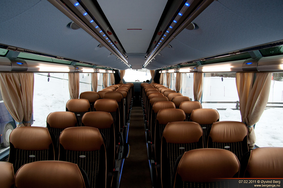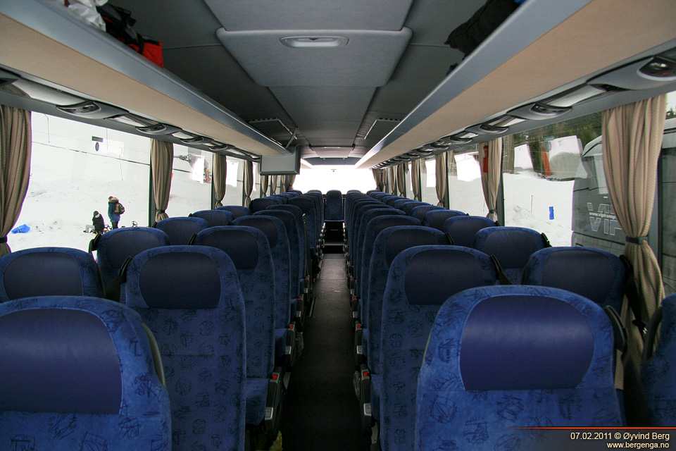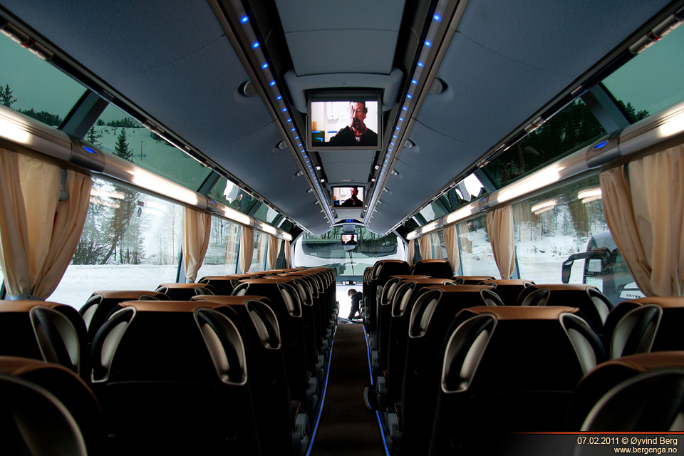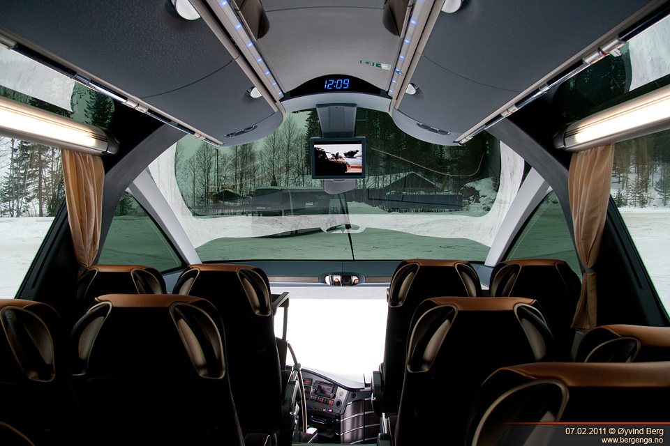 En buss som denne fortjener også noen interiørbilder. I motsetning til foregående buss har denne en utrolig stilfull innredning. Det eneste som ødelegger inntrykket er humpen der setene står oppå toalettet. Ellers er jo utsikten, selv fra midtsetet bak helt utrolig bra. Ingen problemer med å se TV heller, kan man si. De er heldige de ungene som får reise på skidag i et så flott romskip som dette. :)
