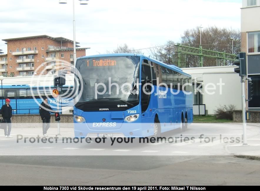 Förmodligen en av Nobina Skövdes nyaste bussar, vagn 7303, Scania Omniexpress, på Västtrafik Express linje 1 mot Trollhättan. Finns det fler vagnar av denna typ i Skaraborg?