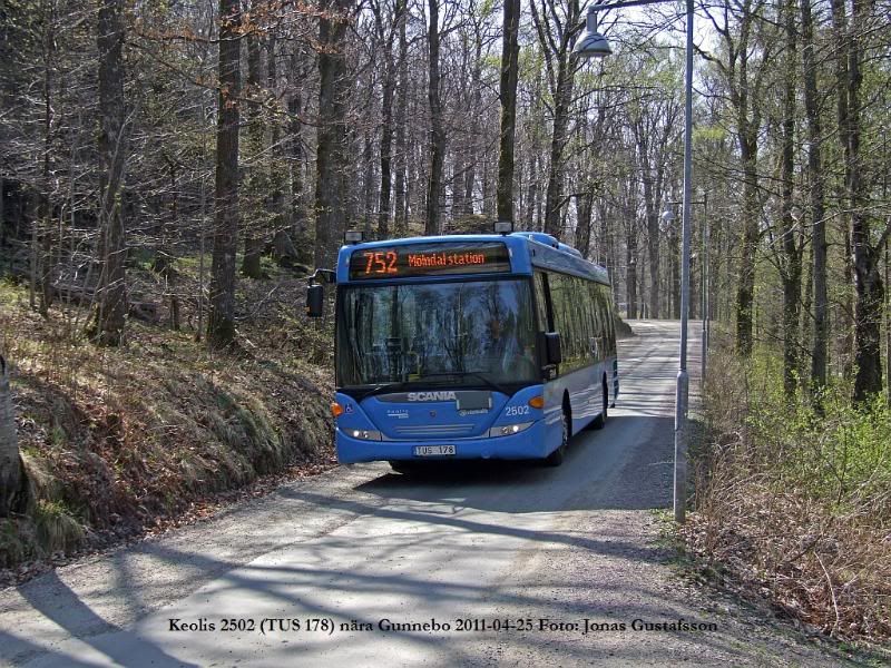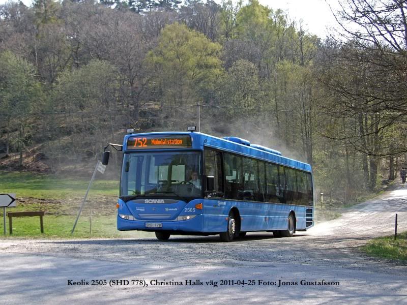 Linje 752 går mellan Mölndals station och Gunnebo, där den skotske affärsmannen John Hall lät uppföra ett vackert sommarresidens i trä under slutet av 1700-talet. Sommarresidenset kallas Gunnebo slott även om beteckningen slott väl är lite missvisande. John Hall var mycket förmögen men hans son John Hall d.y. var en rumlare som snabbt gjorde slut på pengarna och slottet fick säljas. Sedan 1949 ägs slottet av Mölndals stad. I restaurangen intill slottet (uppförd i modern tid efter ritningar av en tänkt flygelbyggnad) åt jag en utmärkt lunchbuffé med familjen efter en promenad i den vackra slottsparken. Vi tog oss dock dit med bil, men det hindrar ju inte att man fotograferar bussar. Speciellt inte om man får chans att fota bussar i vacker miljö.