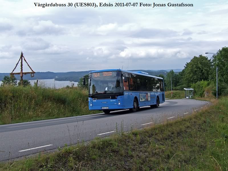 I samband med att jag dokumenterade nya bussar hos Vårgårdabuss fick jag till denna bild på den inte fullt så nya 30 (Vårgårdabuss första av en lång rad Vest-karosserade bussar) vid Edsås på vägen mellan Alingsås och Hindås. Edsås är en by med ett vackert höjdläge och utsikt över sjön Stora Färgen. Fortsätter man bussens väg söderut passerar man byn Ödenäs på en ännu högre moränrygg. Ödenäs är känt för att Göteborgs-TV:S maratonserie Hem till byn är inspelad där. Bussen fortsätter till Olofsered. På den gamla goda tiden kunde man åka buss ända till Hindås.