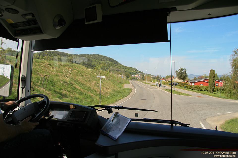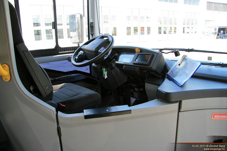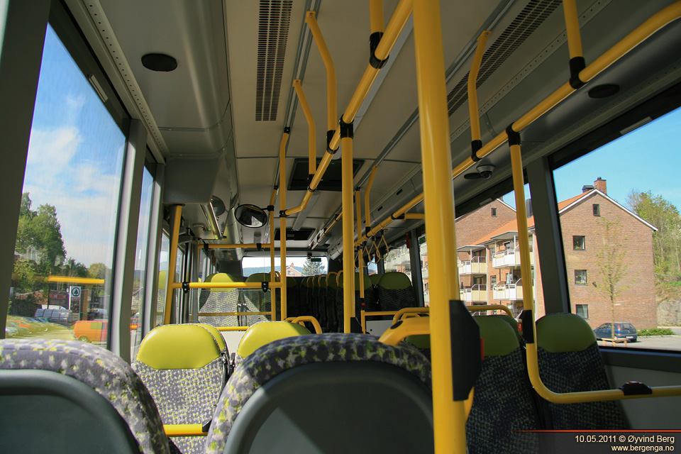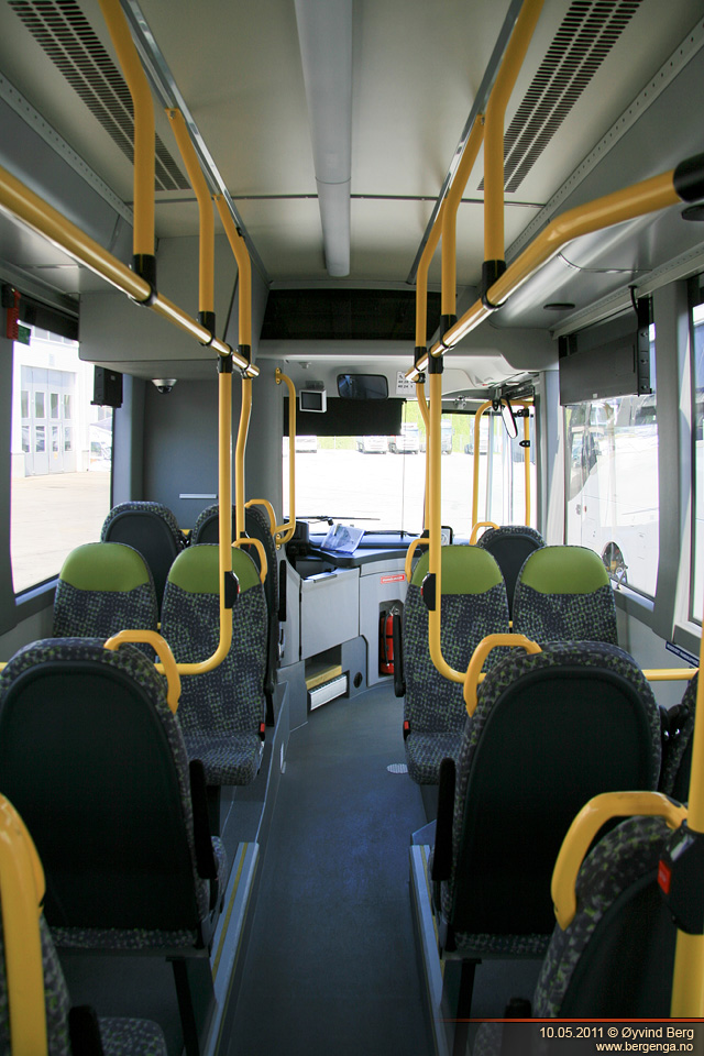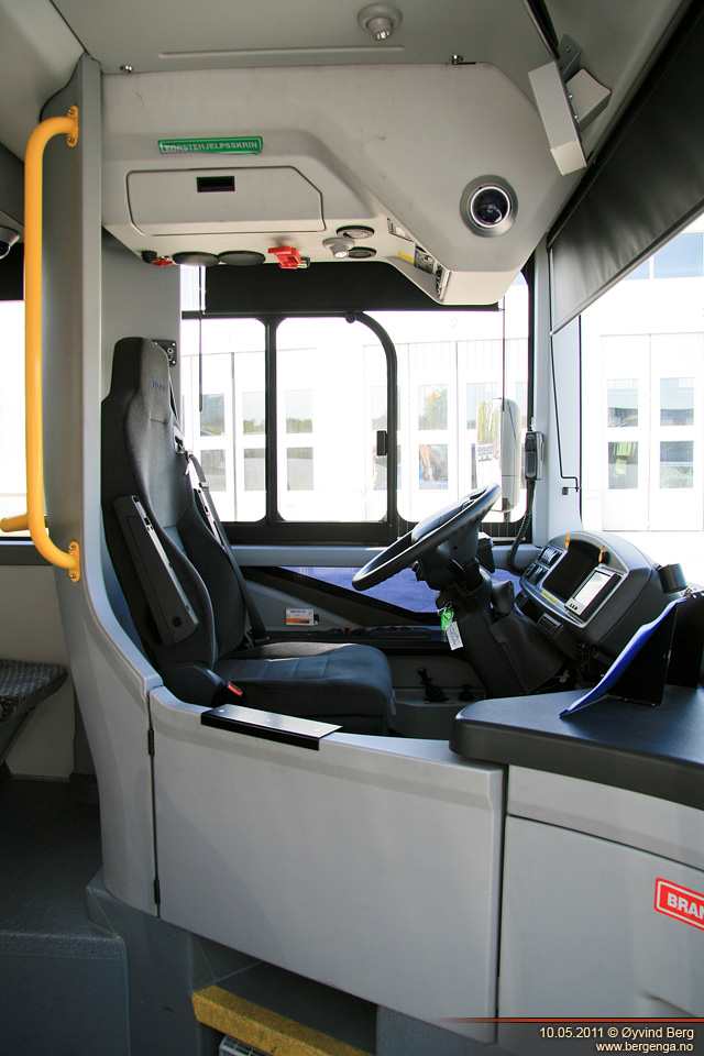 Første halvdel av veien ble det med denne å kjøre på vanlige lokalveier. Naturlig nok plasserte jeg meg i "bussdiggarstolen", altså den som står framover rett bak fordøra. Om det var sjåføren som var ekstra flink eller om det var bussens egenskaper vet jeg ikke, men den gikk veldig mykt og rolig over alle fartshumpene. Det var generelt lite skrangling og ulyder i den, men så har den jo bare såvidt vært brukt som demobuss de siste månedene, så hvor bra de holder får man jo ikke se før om noen år. Setet var godt å sitte i, med tanke på at dette er en buss for korte distanser. På turen tilbake kjørte vi motorveien. Akselerasjonen var ikke mye å skryte av, men det var jo heller ikke å forvente. I 80 km/t ble det litt vindsus fra framdøra, men det var ikke noe jeg kunne kjenne selv om jeg satt rett bak.