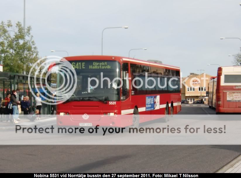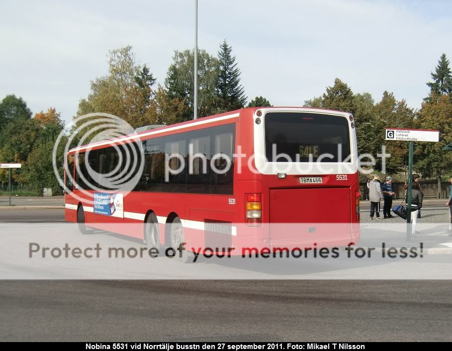 Aktern på Nobina 5531 skiljer sig från Norrtäljes övriga boggievagnar i 55xx-serien då den har vit maskering runt akterrutan.