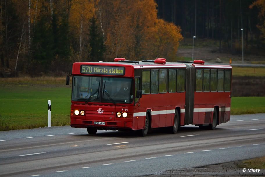 I och med att nästan samtliga linjer i Märsta belagts med lågentrékrav så trodde jag att denna syn var historia, men idag skedde tydligen något som fick den drygt 15,5 år gamla 7144 att rycka ut på linje 570 och 571 i Märsta istället för linje 687 där den hör hemma. Det var verkligen inte igår man såg denna bussmodell i takterna. Vissa fototurer blir bara bättre än man hade hoppats på även om vädret gör allt för att förstöra... :)