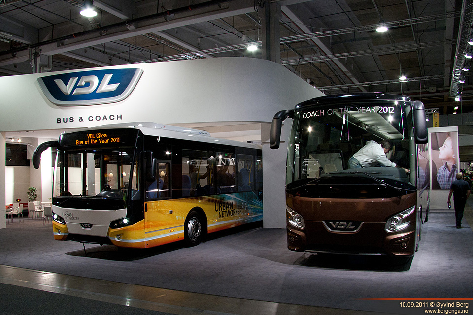VDL Citea SLE-129/310 og VDL Futura FHD2-139/460 på Transport 2011, Norges Varemesse, Lillestrøm, 10.09.2011.